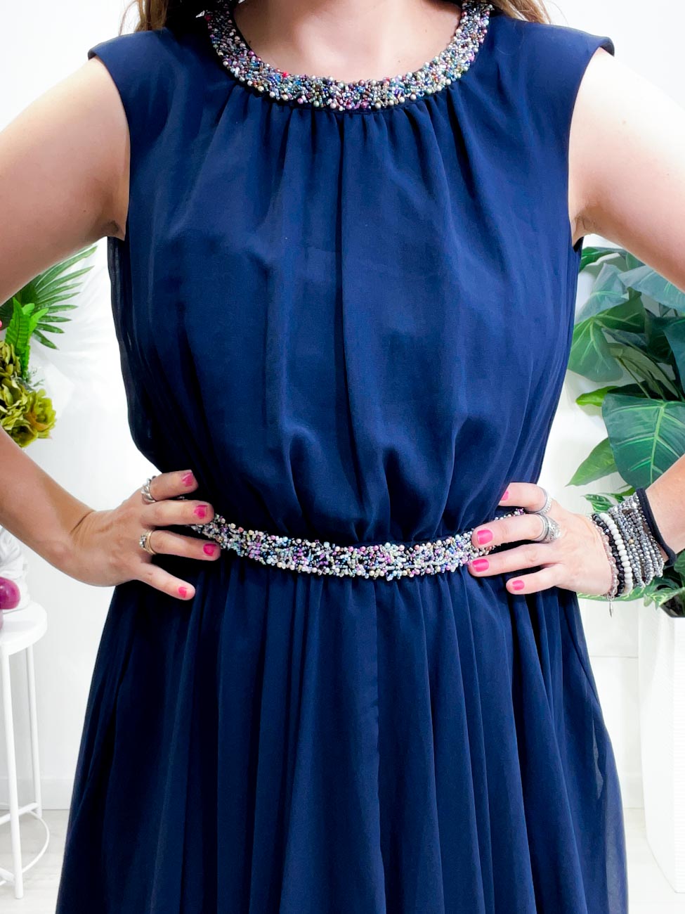 Abito in georgette con girocollo ricoperto di perline colorate e ganci sul dietro per l' abbottonatura. Increspature sul davanti e in vita. Cinturino con perline multicolore anche in vita e gonna molto morbida e svolazzante. Fodera sottostante. Perfetta sia per cerimonie che per look giornalieri. Taglia unica con vestibilità fino a duna M.