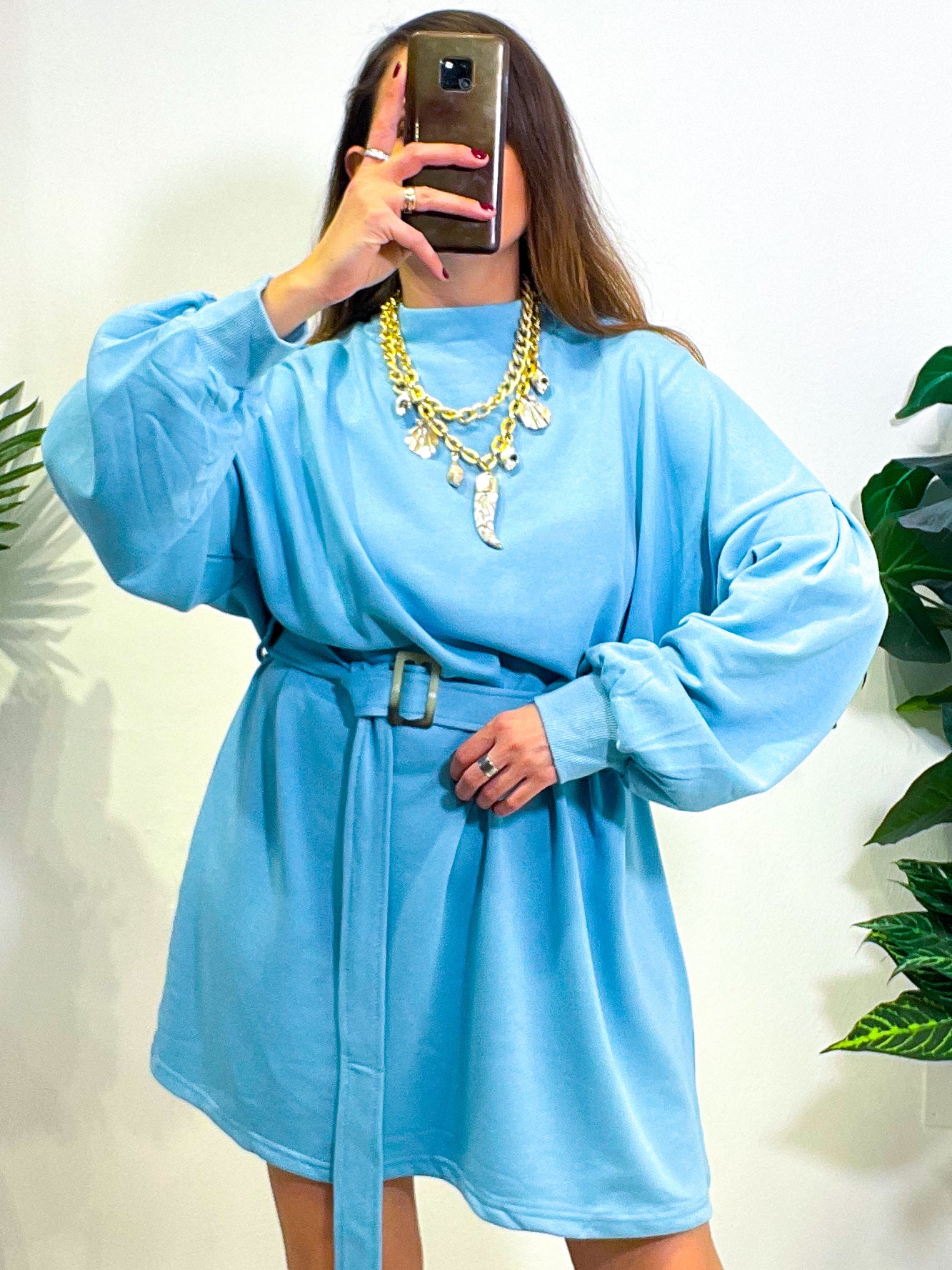 Abito in felpa di cotone super comodo. Mezzo collo e cintura in felpa da annodare in vita con fibbia. Manica morbida con polsino in costina. Vestibilità morbida in taglia SM e ML.