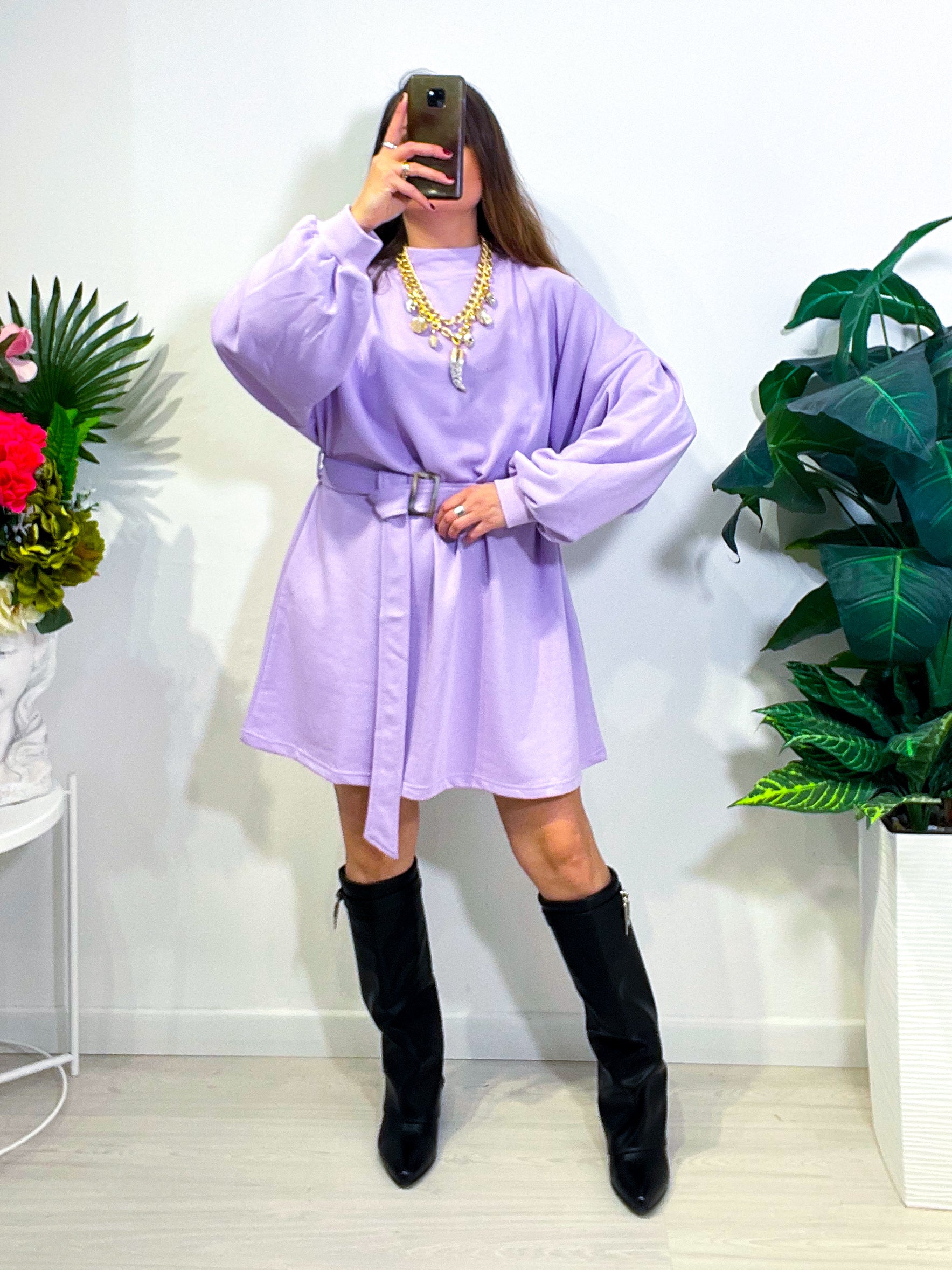 Abito in felpa di cotone super comodo. Mezzo collo e cintura in felpa da annodare in vita con fibbia. Manica morbida con polsino in costina. Vestibilità morbida in taglia SM e ML.