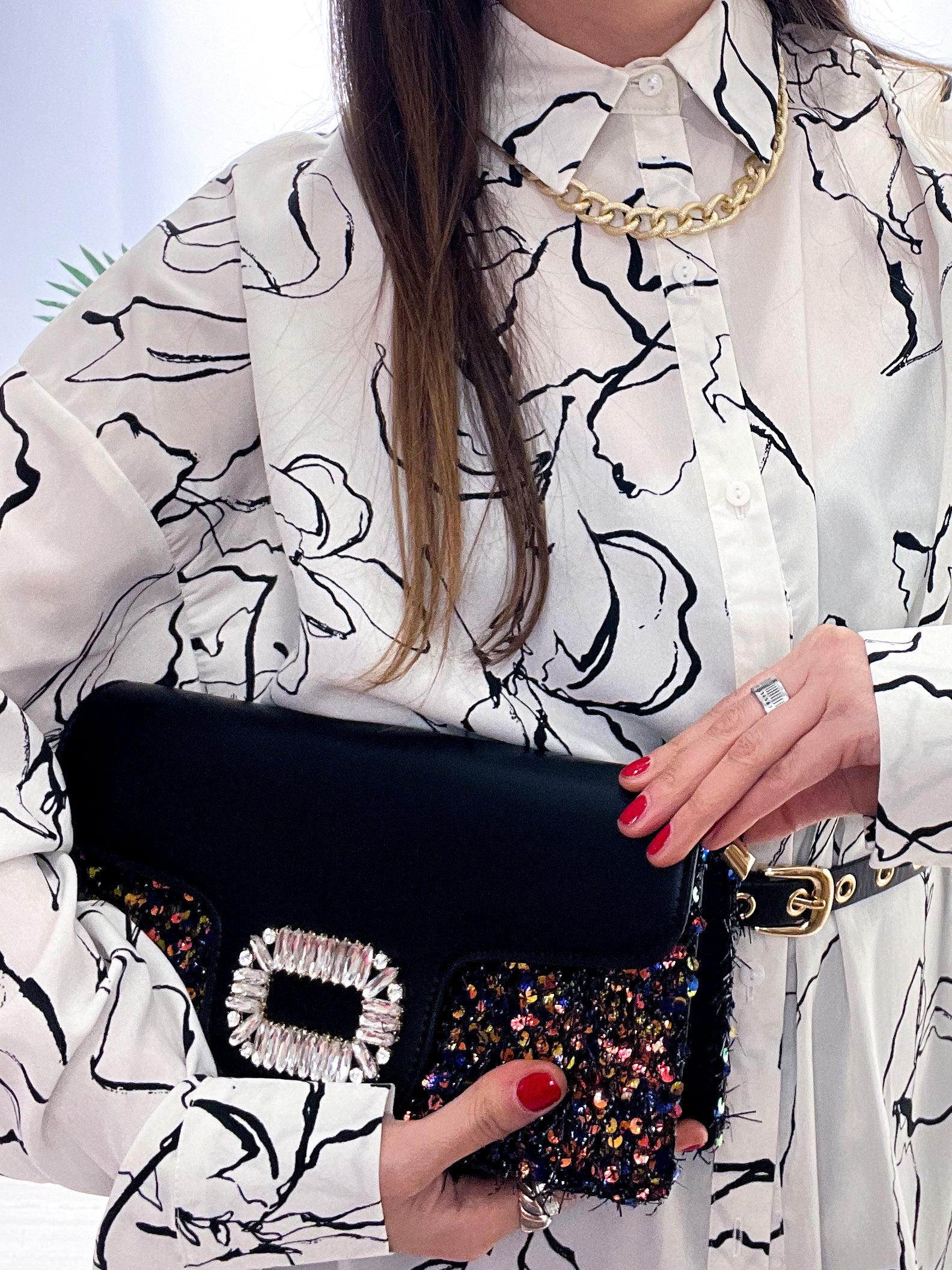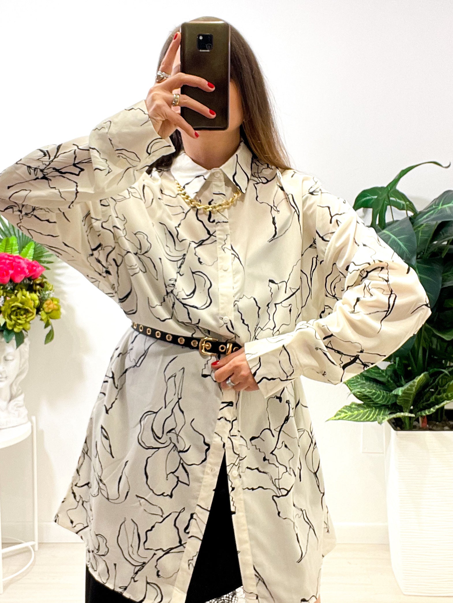 Maxi camicia fantasia con manica calata e polsino alto. Vestibilità over dove in combo con una cintura crea un perfetto punto vita. Un capo statement che aggiunge carattere a ogni look.