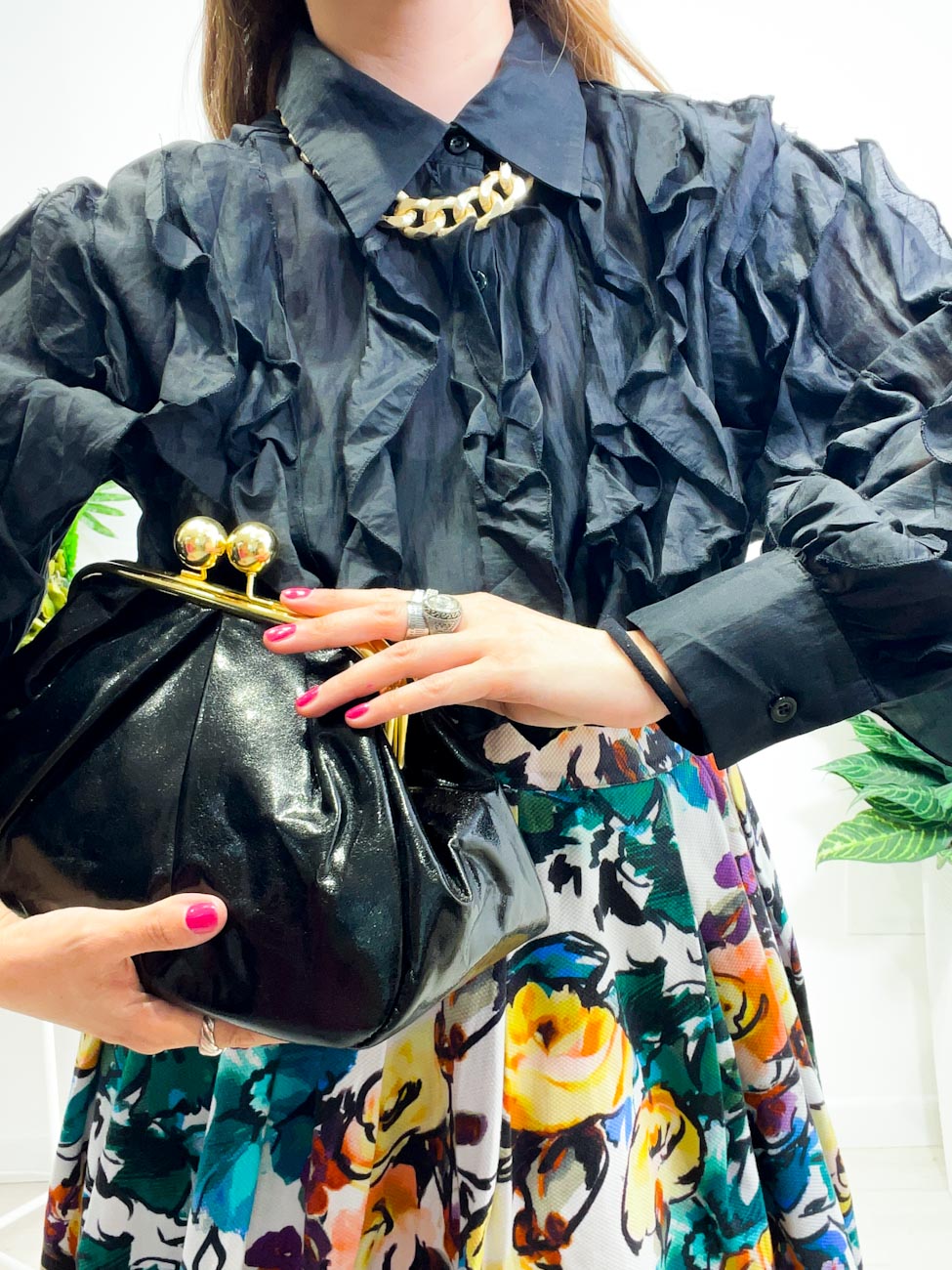 Camicia over interamente coperta da delicate ruches sul davanti e sulle maniche, che la rendono semplice ma al contempo particolare. Un capo che unisce eleganza e originalità, perfetto per un look sofisticato ma non troppo impegnativo. Taglia unica, con una vestibilità morbida che arriva fino a una L. Un'ottima scelta per chi cerca uno stile unico e confortevole.