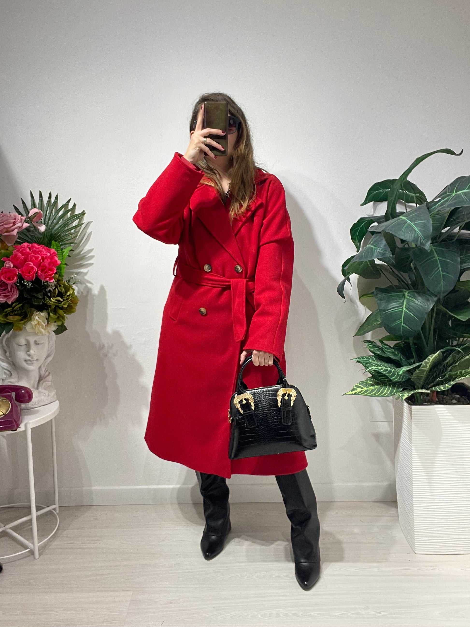 Un cappotto doppiopetto in tessuto pesante con ampio rever fusciacca da annodare. Tasche laterali a filo e fusciacca da annodare in vita. Manica mordida e tasche laterali. Taglia unica con vestibilità morbida fino ad una L. Perfetto sia per look da giorno che per look da sera.
