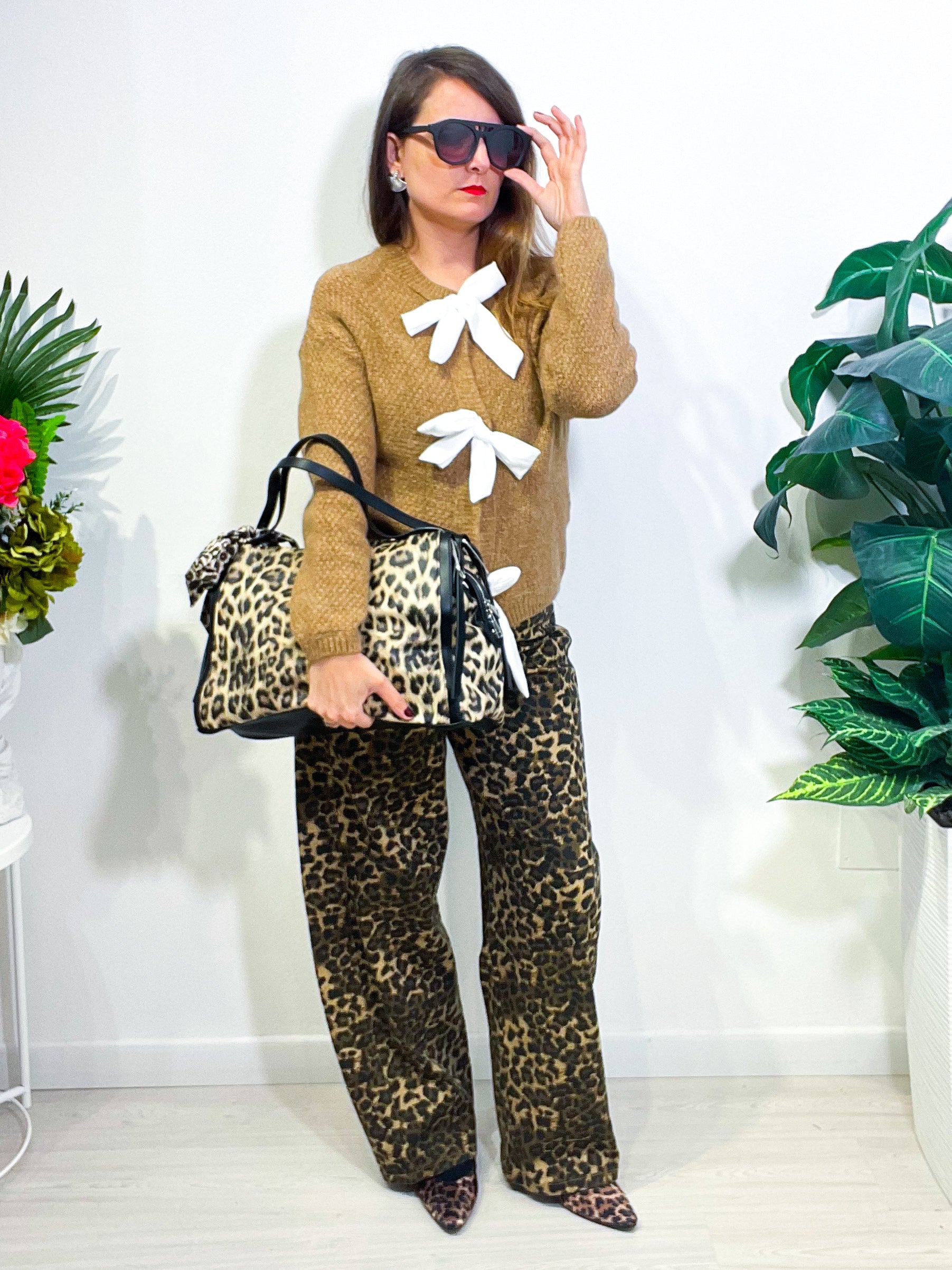 Cardigan morbidissimo con fiocchi centrali in contrasto che aggiungono un tocco di femminilità. Comodo e chic, perfetto per ogni occasione. Taglia unica, con vestibilità che si adatta fino alla L.