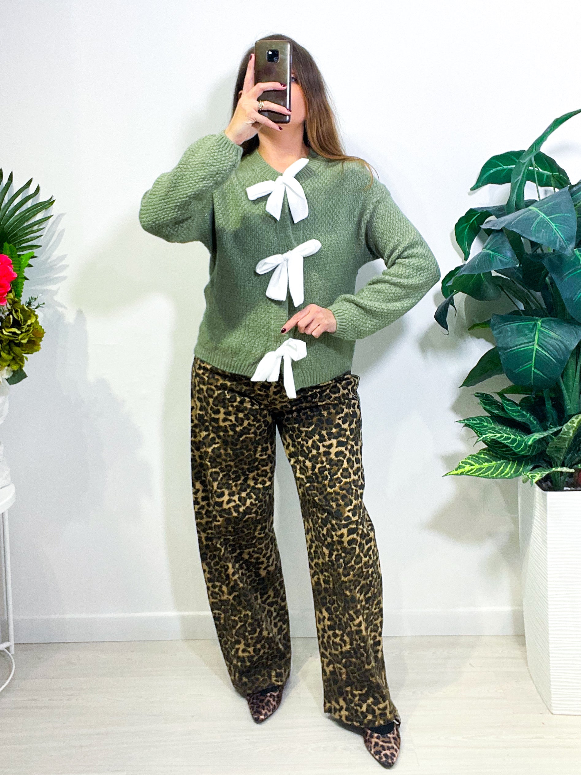 Cardigan morbidissimo con fiocchi centrali in contrasto che aggiungono un tocco di femminilità. Comodo e chic, perfetto per ogni occasione. Taglia unica, con vestibilità che si adatta fino alla L.