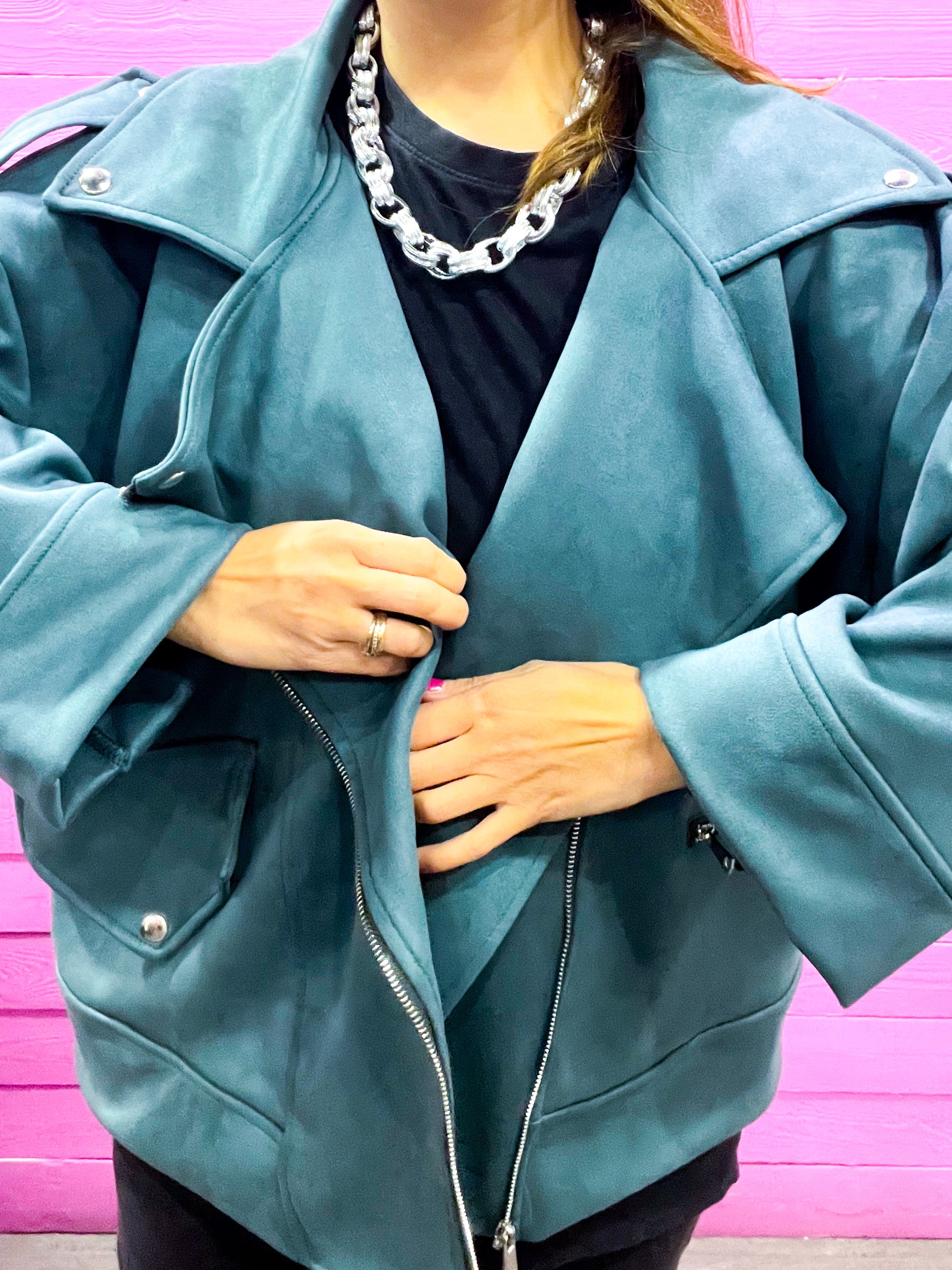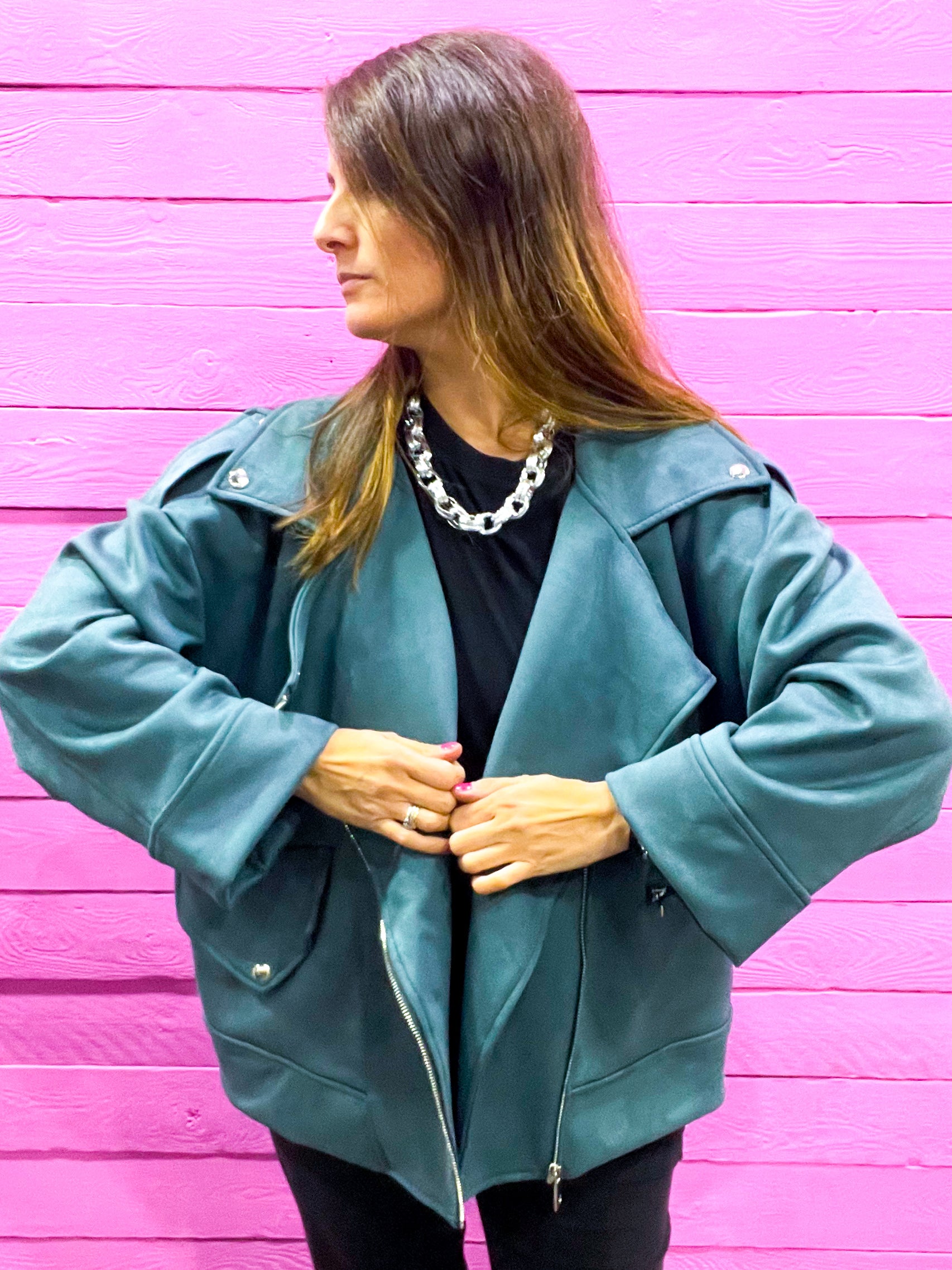 Giacchetto Chiodo in tessuto scamosciato e super morbido con ampio rever e maniche ampie. Zip davanti, non foderato. Taglia unica che va fino a una XL.