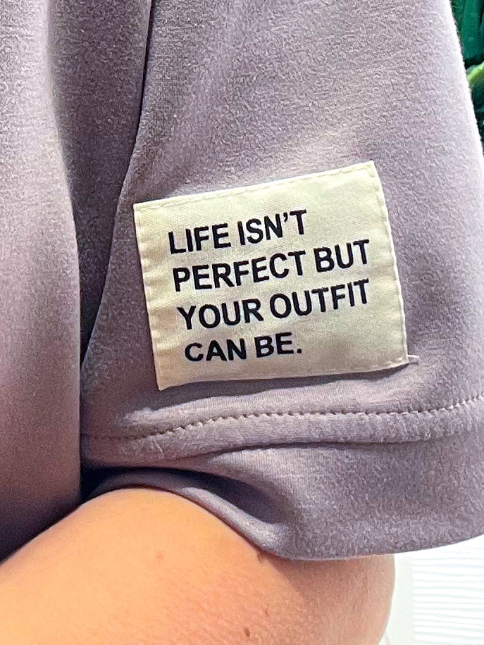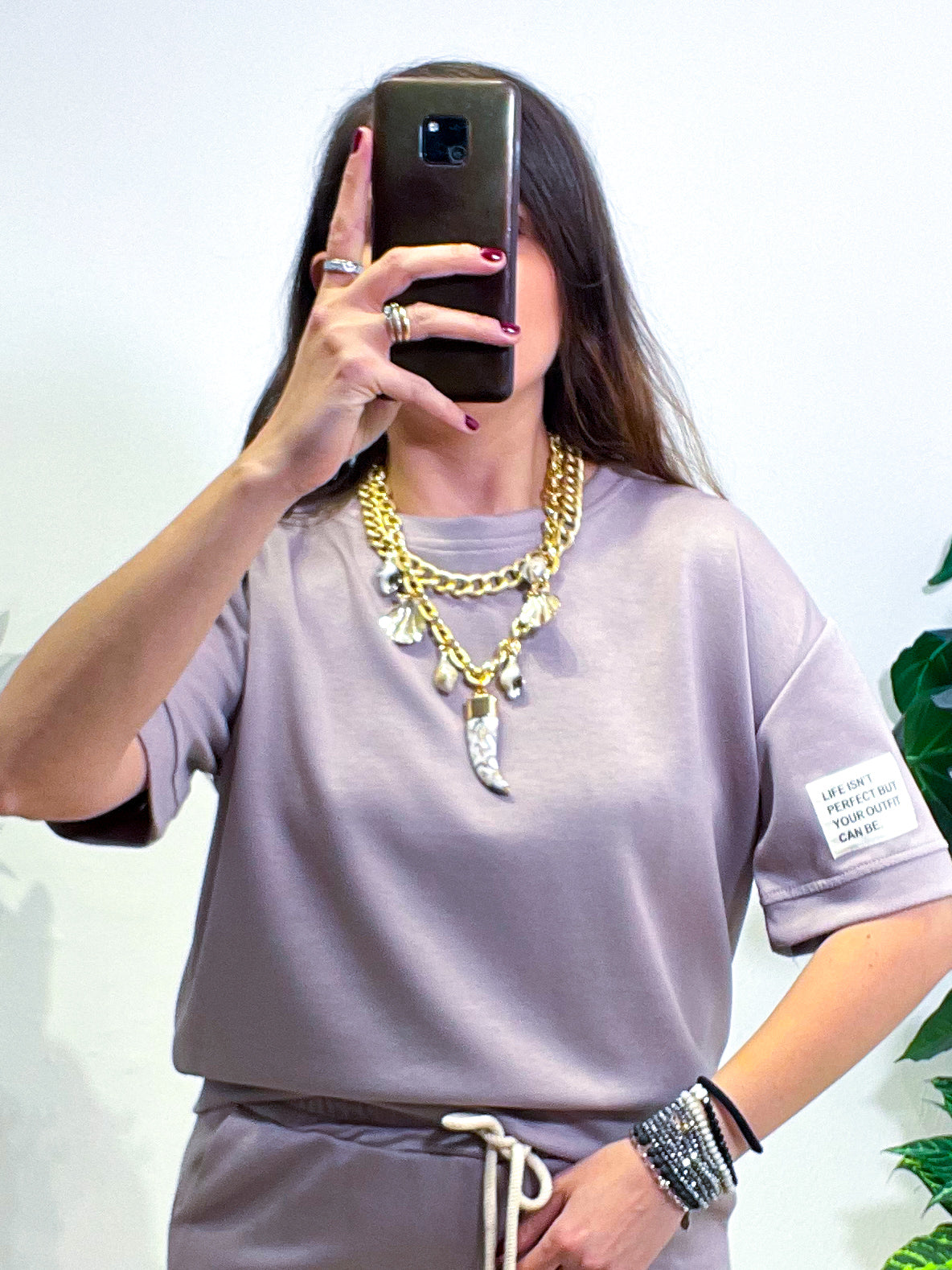 Completo in tessuto sportivo mezza manica e vestibilità morbida con etichetta su una di esse. Pantalone morbidissimo con tasche, elastico in vita e coulisse. Elastico alle caviglie. Taglia unica con vestibilità fino ad una L.