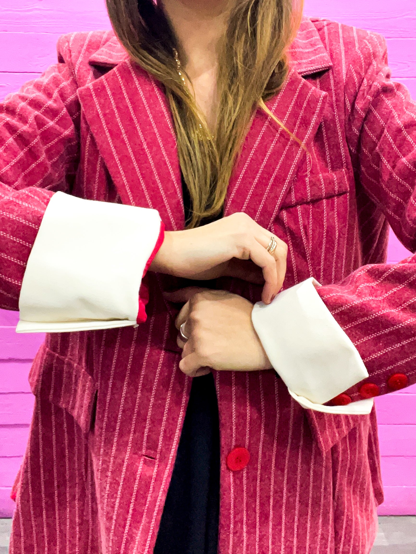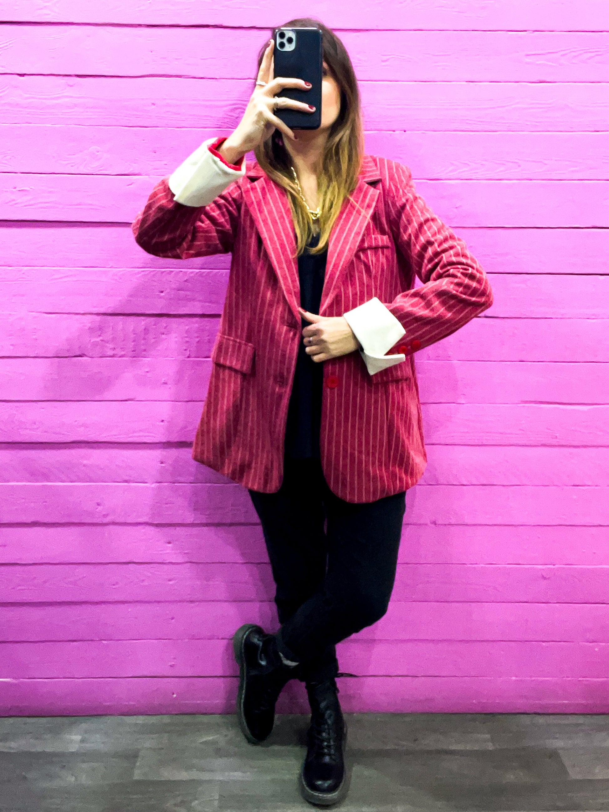 Giacca doppio bottone con ampio rever e finte tasche in tessuto gessato. Particolarità alla manica con grande risvolto e bottoni in tono. Fodera interna e spalline. Spacco nel dietro con bottoni in contrasto. Taglia unica, con vestibilità fino a una L. Un capo dallo stile vintage e particolare, perfetto per chi cerca un look deciso e diverso dal solito.