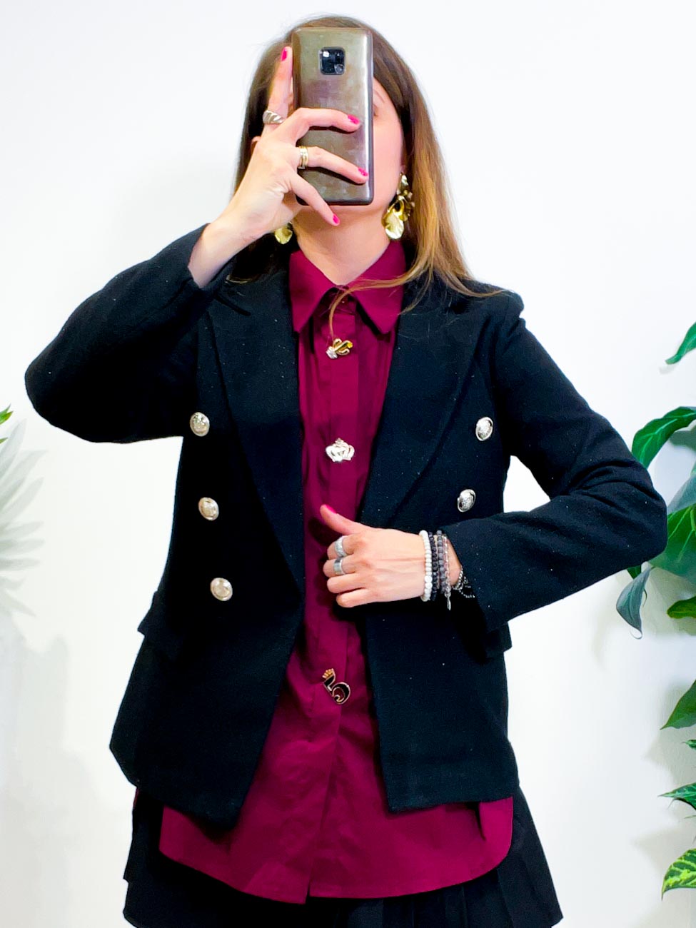 La giacca è in tessuto pesante simil Chanel con filo lurex interno e con bottoni metallo incisi. Revers a pinta e finte tasche con pattina. Spalline interne. Vestibilità slim.
