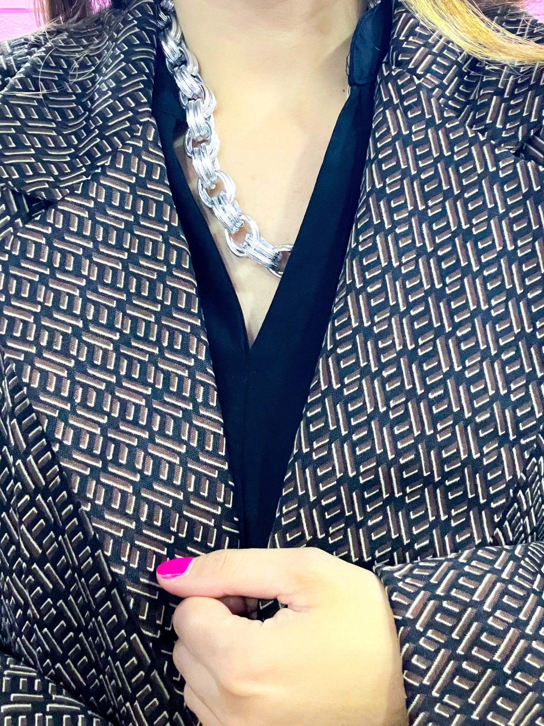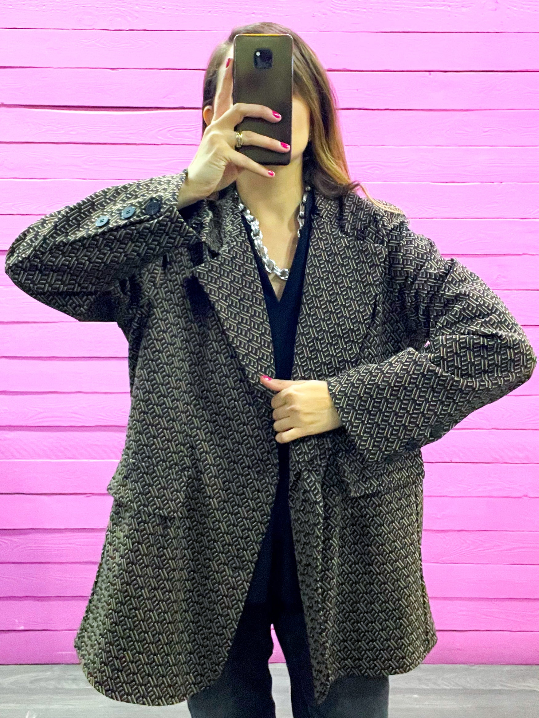 Giacca in stile anni 70 optical dal taglio doppiopetto con spalline che esaltano la silhouette. Fodera interna e bottoni alle maniche. Taglia unica, con vestibilità slim che arriva fino a una XL. Un capo dallo stile vintage e moderno, perfetto per chi cerca un look deciso e raffinato.