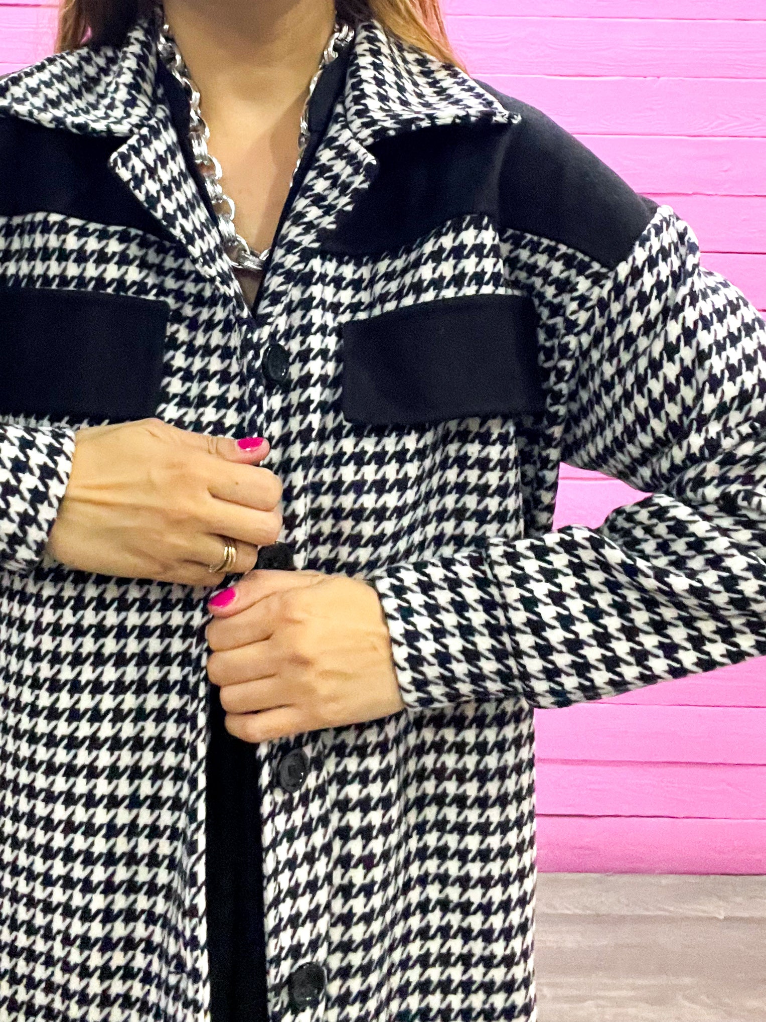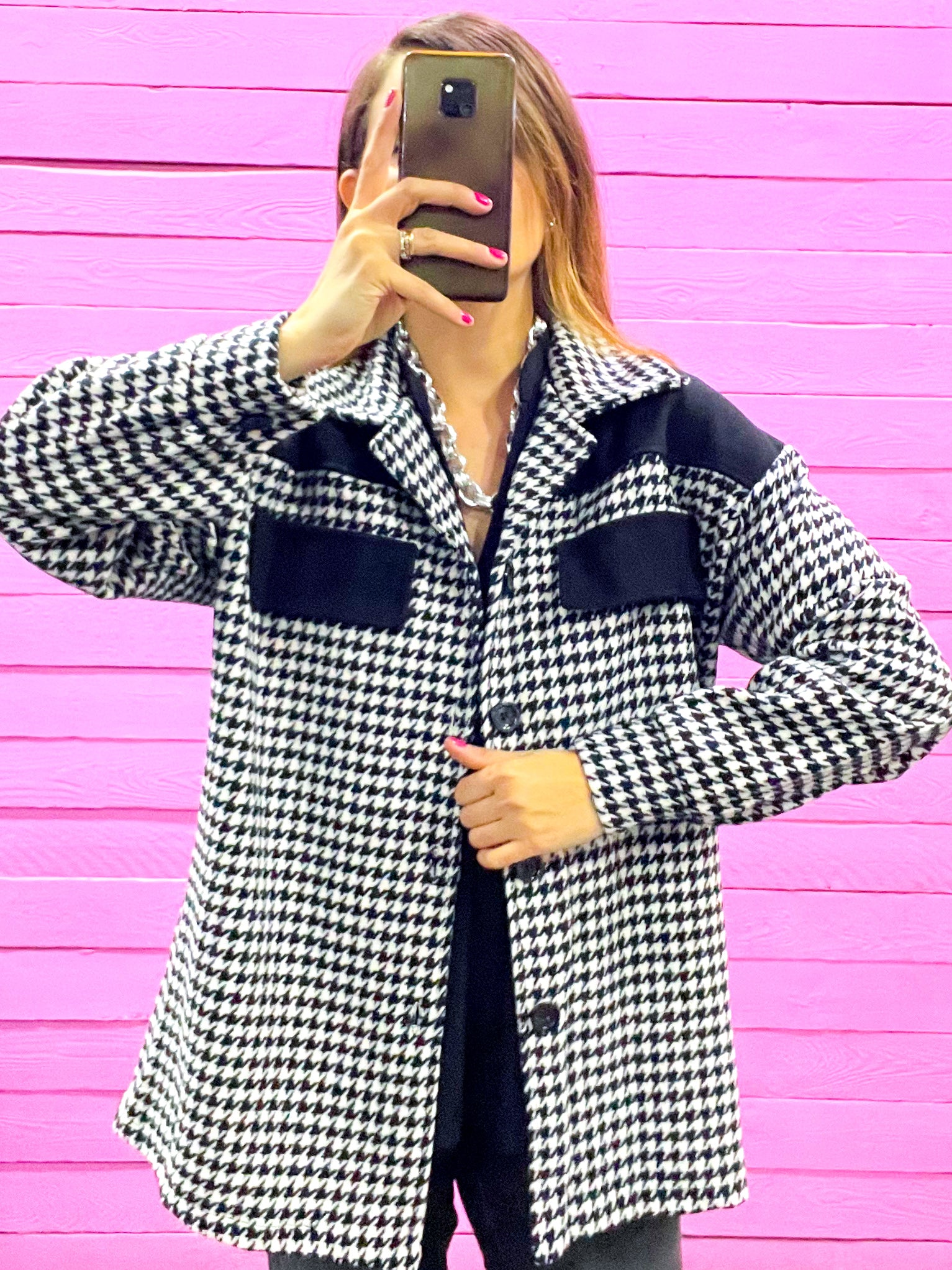 Giacca in tessuto pesante in stile camicia in fantasia piede de poule e sprone in contrasto. Finte tasche con pattina. Taglia unica, con vestibilità slim che arriva fino a una XL. Un capo comodo e caldo, perfetto per un look giornaliero.