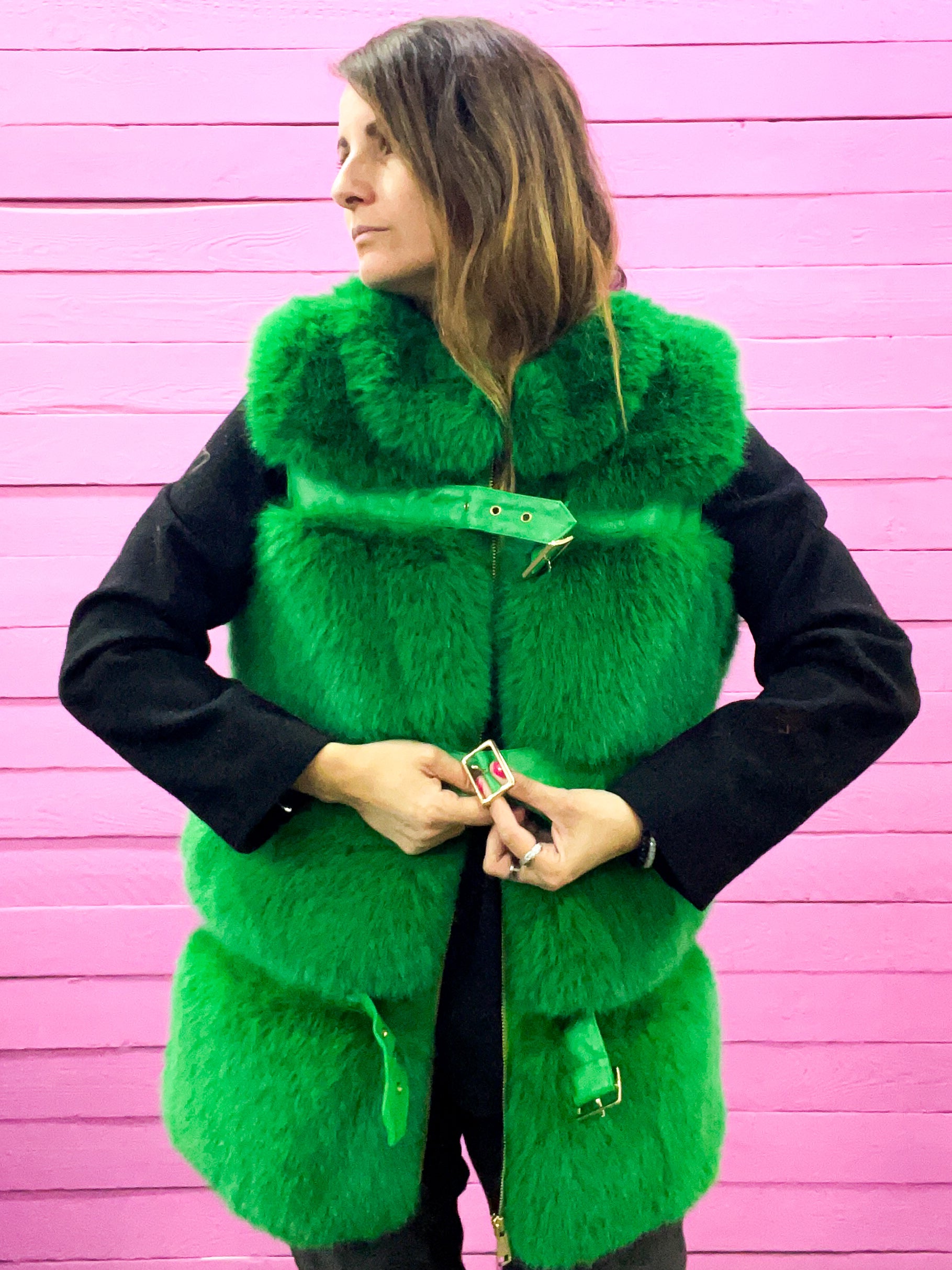 Gilè in pelliccia Eco Fur con inserti in ecopelle e fibbie e zip davanti. Tasche laterali. Taglia unica con vestibilità fino ad una L. Perfetta da indossare con un giacchetto in ecopelle o giacca simple in contrasto, da indossare anche sbottonata per uno stile rock.