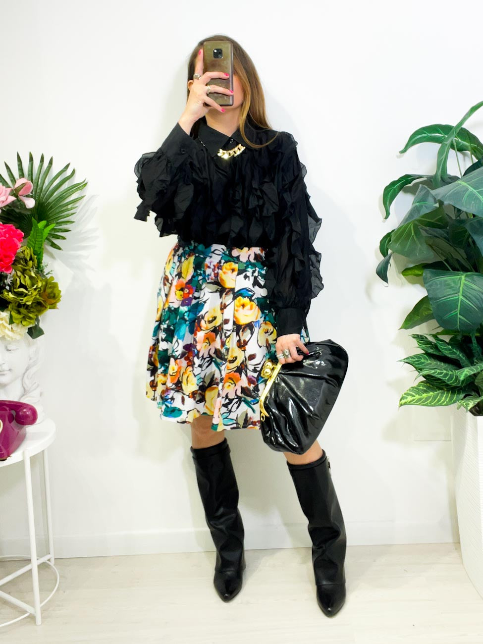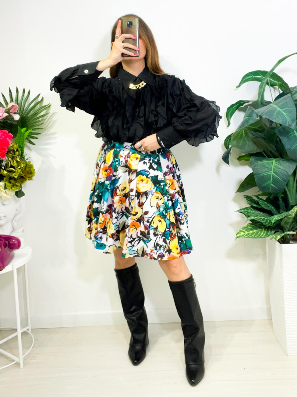 Gonna multicolore fantasia in tessuto rigido a nido d'ape con pieghe e tasche laterali e zip. In perfetto stile anni 50 darà stile ai tuoi look. Taglia unica con vestibilità fino ad una M.
