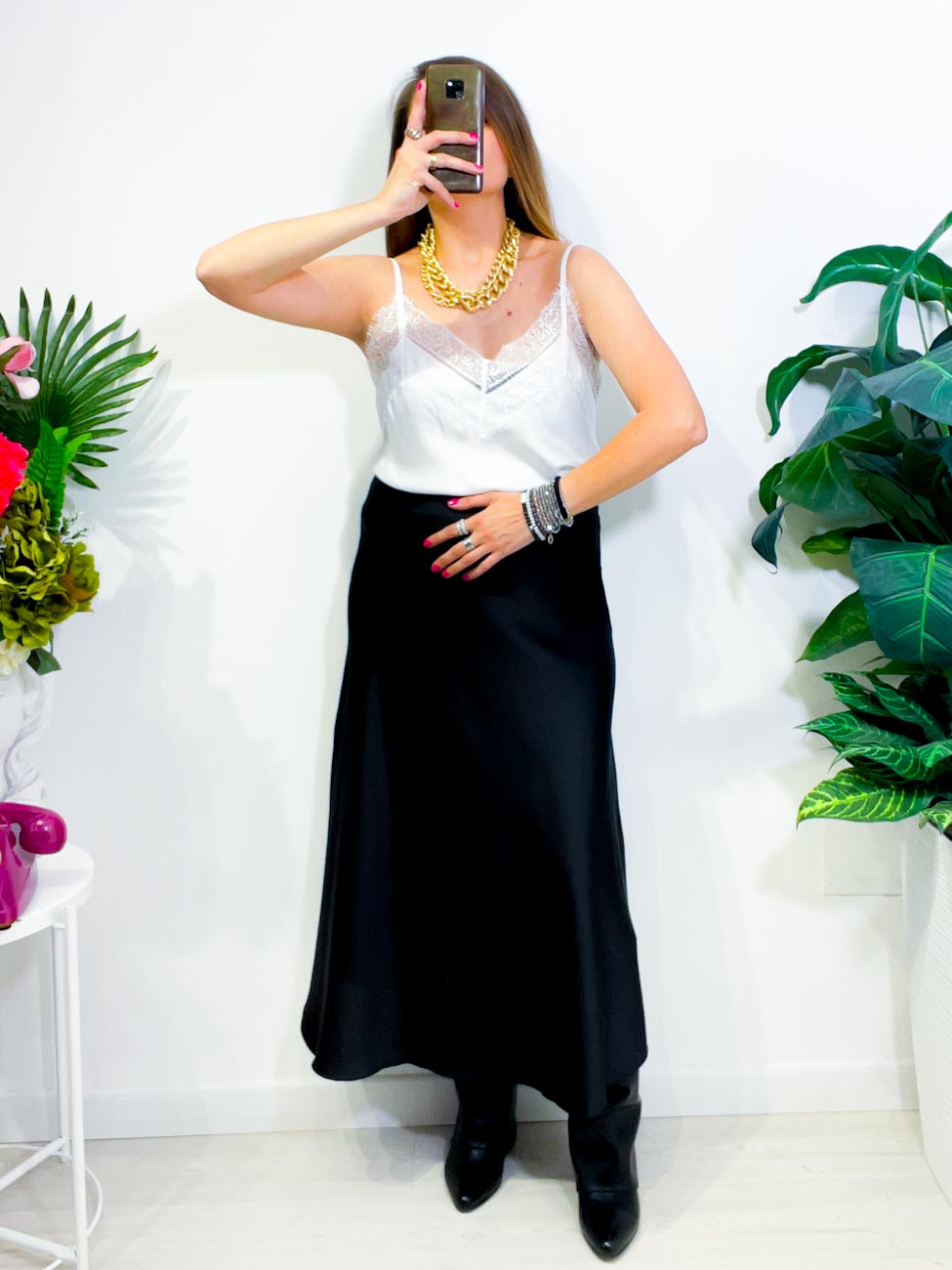 Gonna in similraso con lunghezza 3/4 e elastico in vita, perfetta per un look elegante e comodo. La Gonna Loren è taglia unica, con una vestibilità che arriva fino a una M. Un capo versatile che si adatta facilmente a diverse occasioni, per un tocco di classe senza rinunciare al comfort.