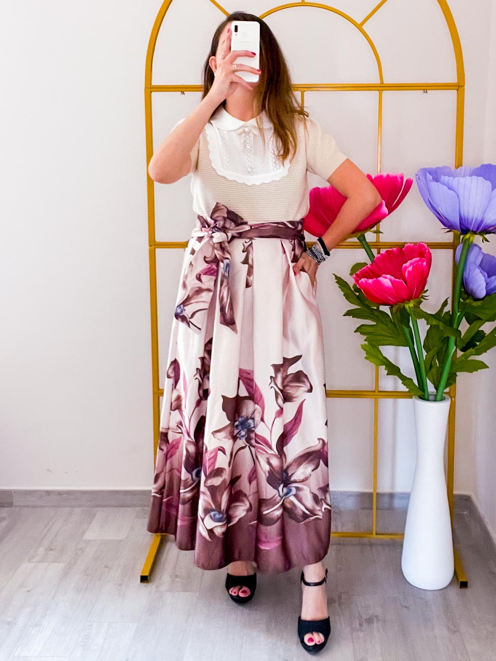 Questa gonna midi a pieghe unisce eleganza e praticità in un capo pensato per le occasioni speciali. Realizzata in un tessuto stampato effetto simil-taffetà rigido, dona una forma strutturata e sofisticata senza rinunciare al comfort. La fusciacca larga da annodare lateralmente crea un punto vita femminile e valorizzante, mentre l’elastico sul retro assicura una vestibilità flessibile e comoda. Le tasche laterali aggiungono un tocco funzionale senza compromettere lo stile. Taglia unica, adatta fino a una M/L.