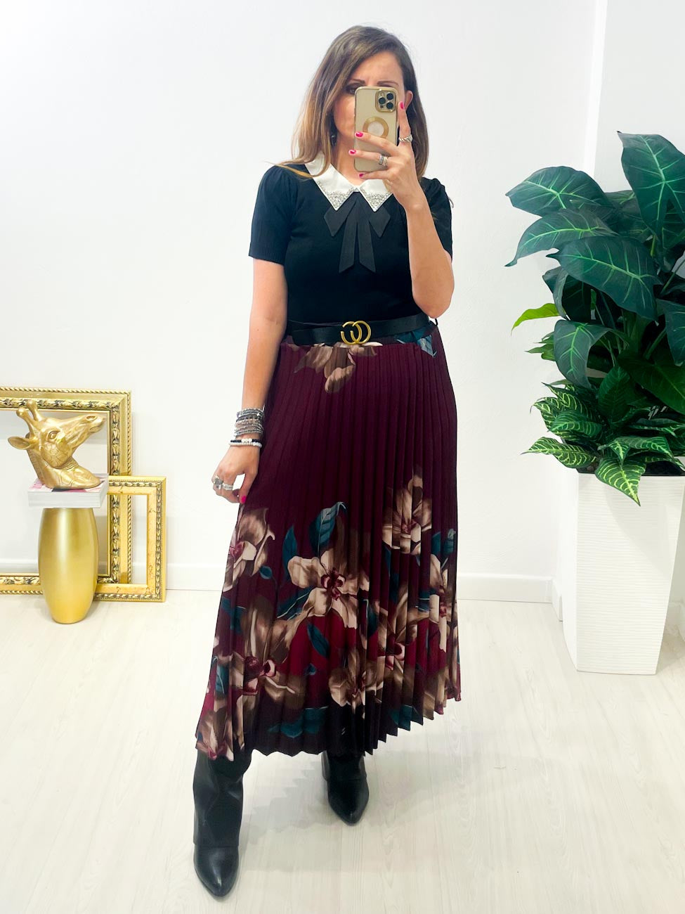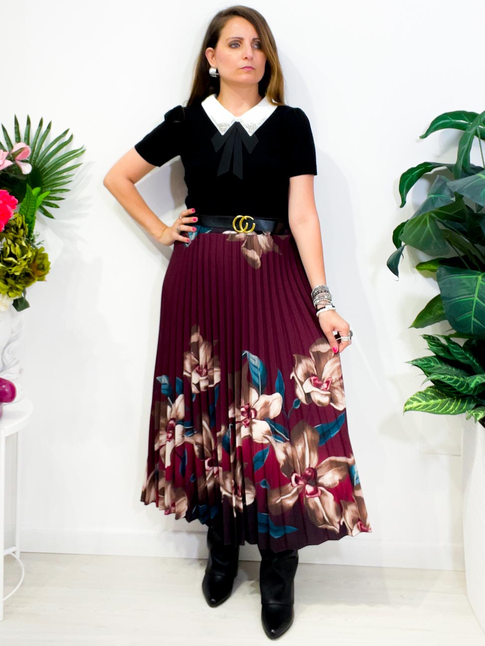 Gonna Plissè Fiori Bordeaux