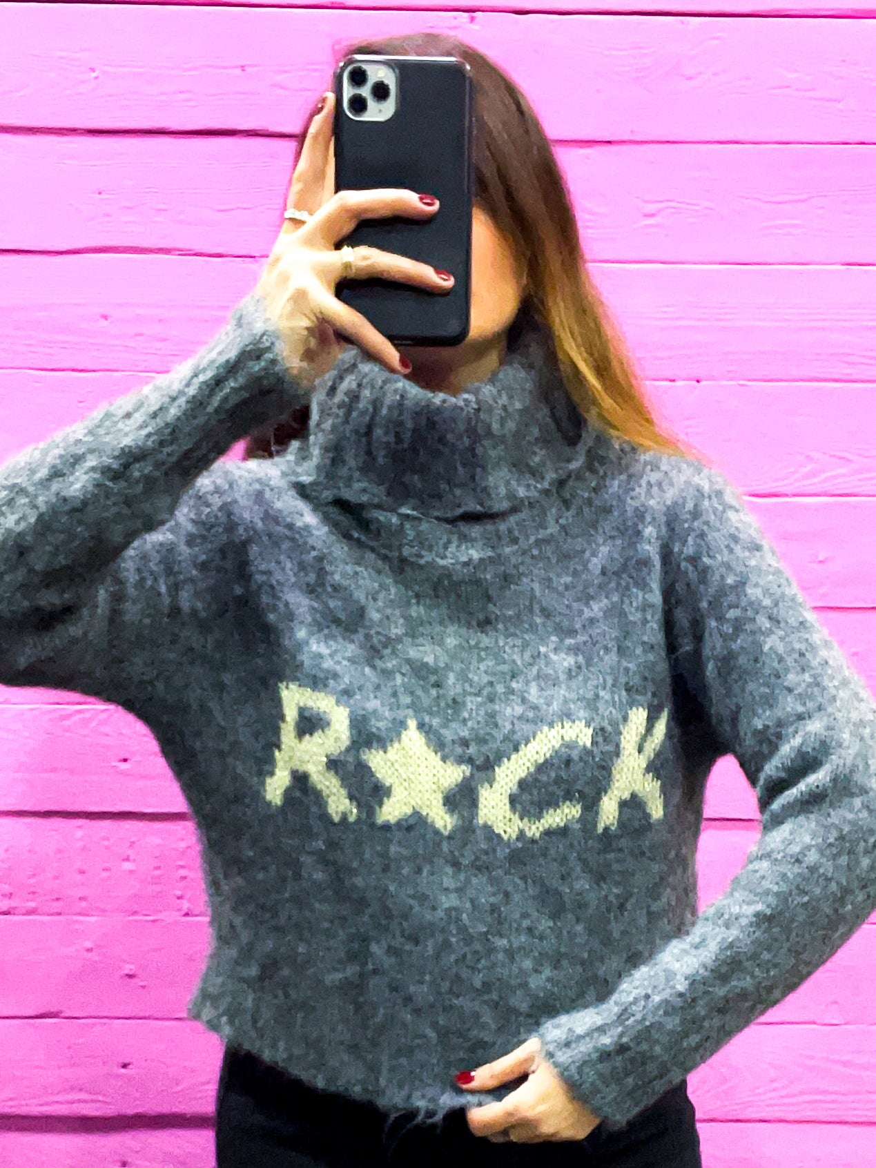 Maglione a collo alto morbido e super calda. Questa maglia in filato pelucchioso ha un ricamo in filo lurex a contrasto. Leggermente crop, è perfetta per chi ama il comfort con un tocco di stile "rock". Taglia unica, vestibilità fino a una L.