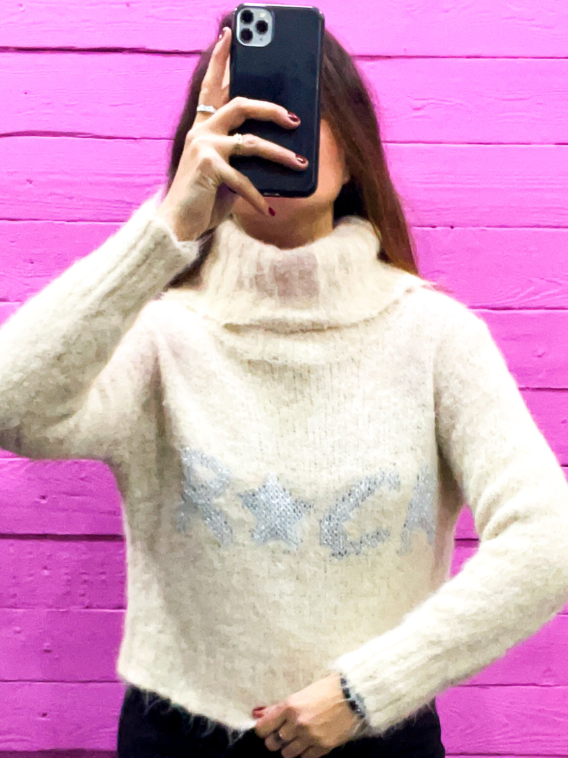 Maglione a collo alto morbido e super calda. Questa maglia in filato pelucchioso ha un ricamo in filo lurex a contrasto. Leggermente crop, è perfetta per chi ama il comfort con un tocco di stile "rock". Taglia unica, vestibilità fino a una L.