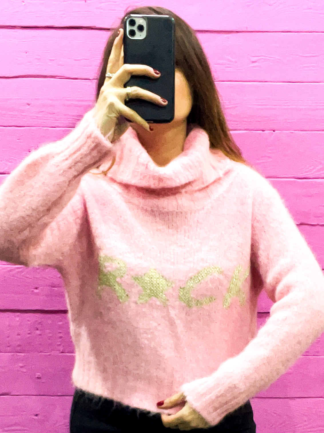 Maglione a collo alto morbido e super calda. Questa maglia in filato pelucchioso ha un ricamo in filo lurex a contrasto. Leggermente crop, è perfetta per chi ama il comfort con un tocco di stile "rock". Taglia unica, vestibilità fino a una L.