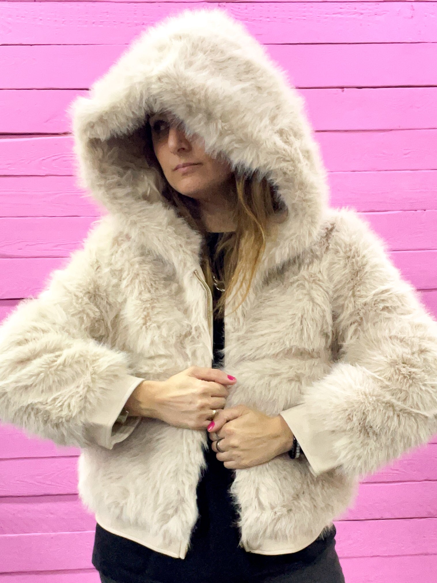 Pelliccia Eco Fur con cappuccio e super morbidosissima. Cappuccio. Inserti in ecopelle ai polsini, sul braccio, sul davanti e sul fondo. Zip di chiusura. Taglia unica con vestibilità over fino ad una L. La pelliccia perfetta per coccolarsi dal freddo.