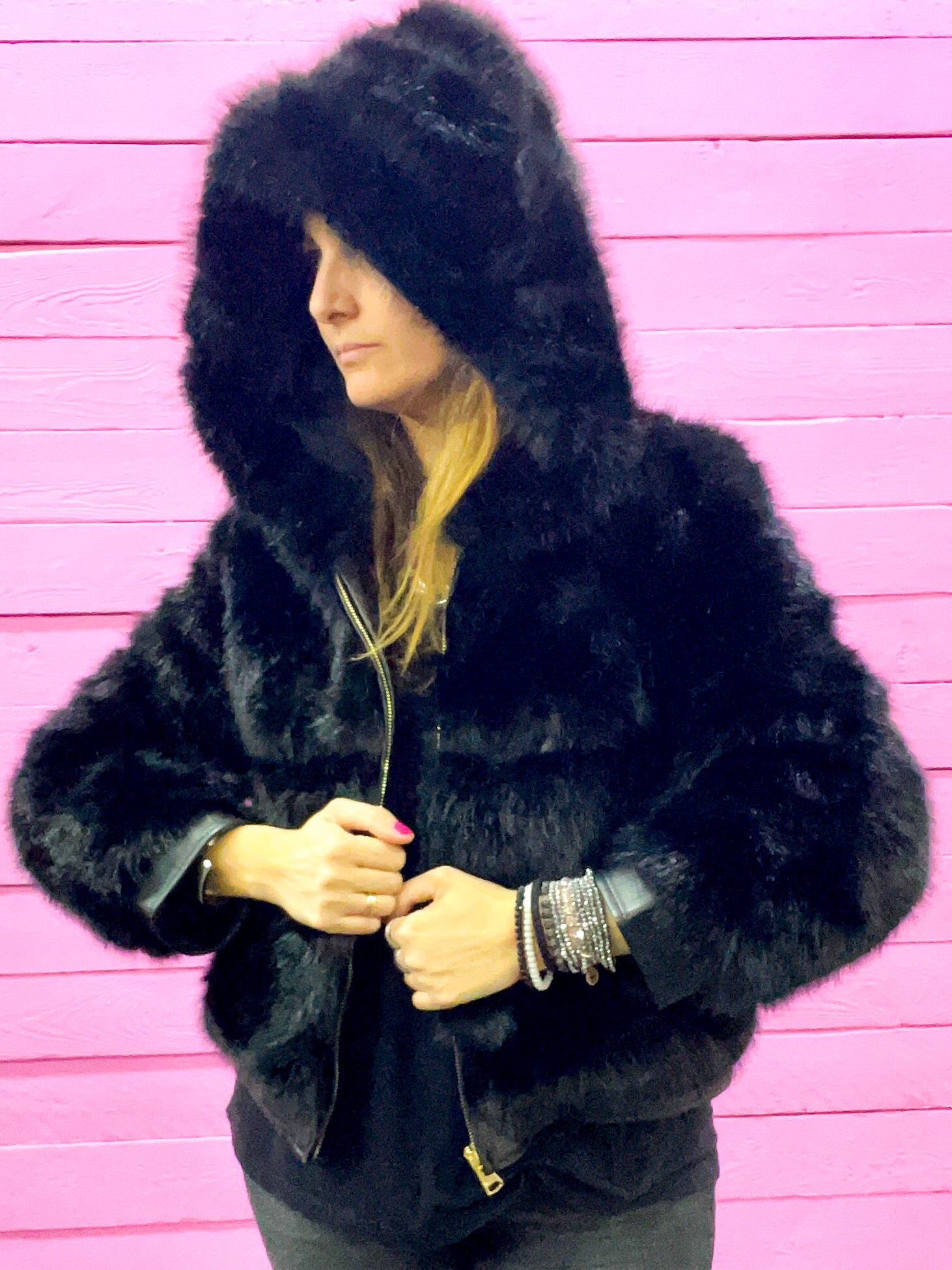 Pelliccia Eco Fur con cappuccio e super morbidosissima. Cappuccio. Inserti in ecopelle ai polsini, sul braccio, sul davanti e sul fondo. Zip di chiusura. Taglia unica con vestibilità over fino ad una L. La pelliccia perfetta per coccolarsi dal freddo.