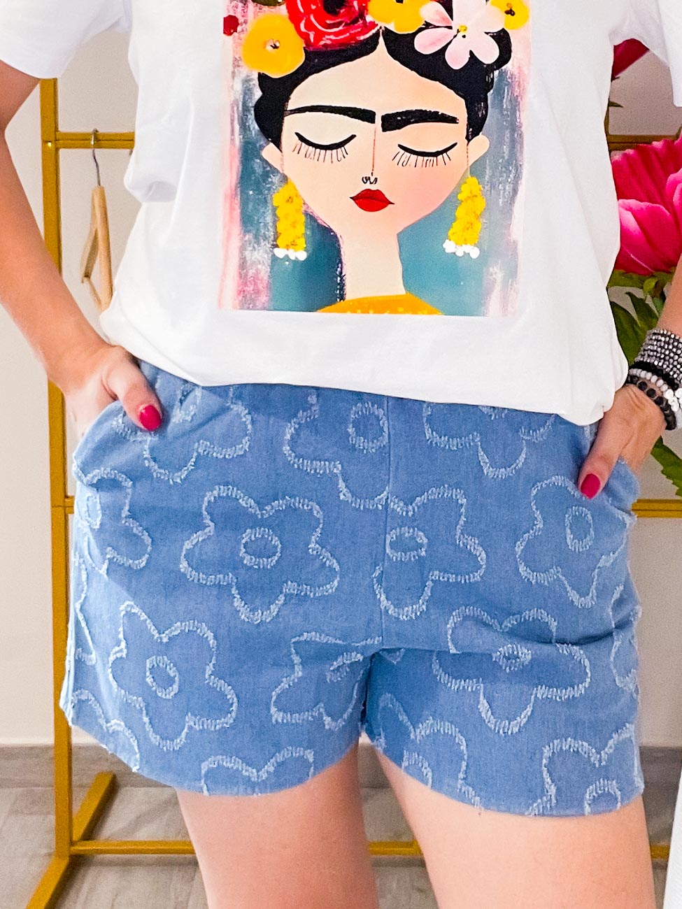 Shorts in denim con ricamo floreale in leggero rilievo, realizzato con filato tono su tono in una sfumatura leggermente più chiara per un effetto raffinato e delicato. Dotati di elastico in vita per una vestibilità comoda e tasche a filo laterali. Taglia unica con vestibilità slim, consigliata fino a una M.