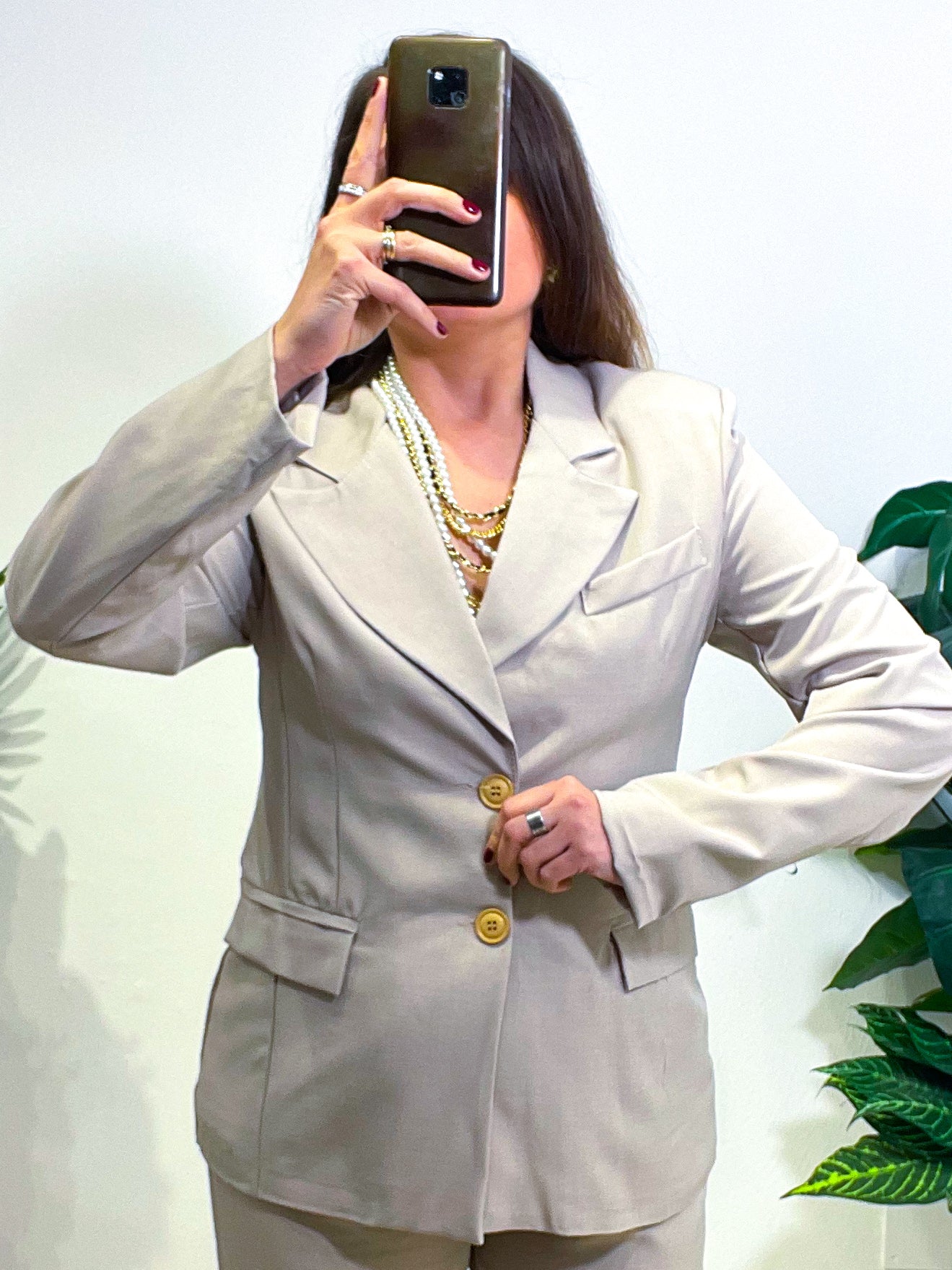 Un tailleur comodo e raffinato. Con 2 bottoni per l'abbottonatura e lunge pinces sul davanti. Ampio rever e tasche con pattina. Pantalone dritto e leggermente più corto con elastico sul dietro e bottone con zip davanti. Taglia unica, con una vestibilità fino ad una ML, per un tailleur super raffinato ed easy.