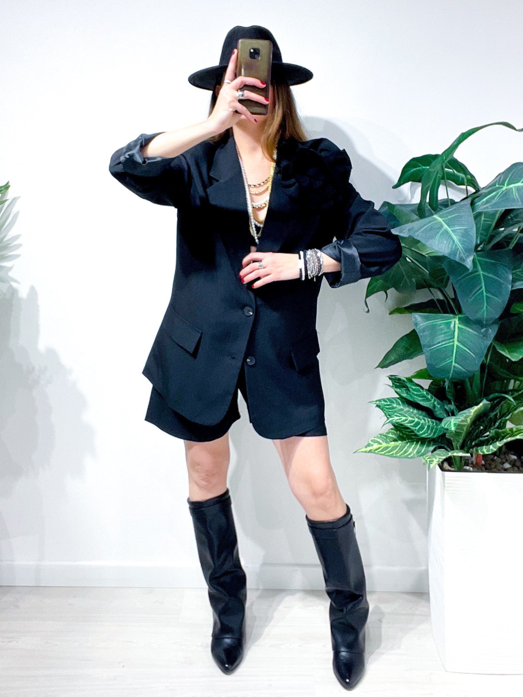 Un tailleur diverso dal solito con spilla fiore sul davanti. Shorts a vita alta con elastico sul dietro. Taglia unica, con una vestibilità fino ad una ML, per un tailleur super raffinato ed easy.
