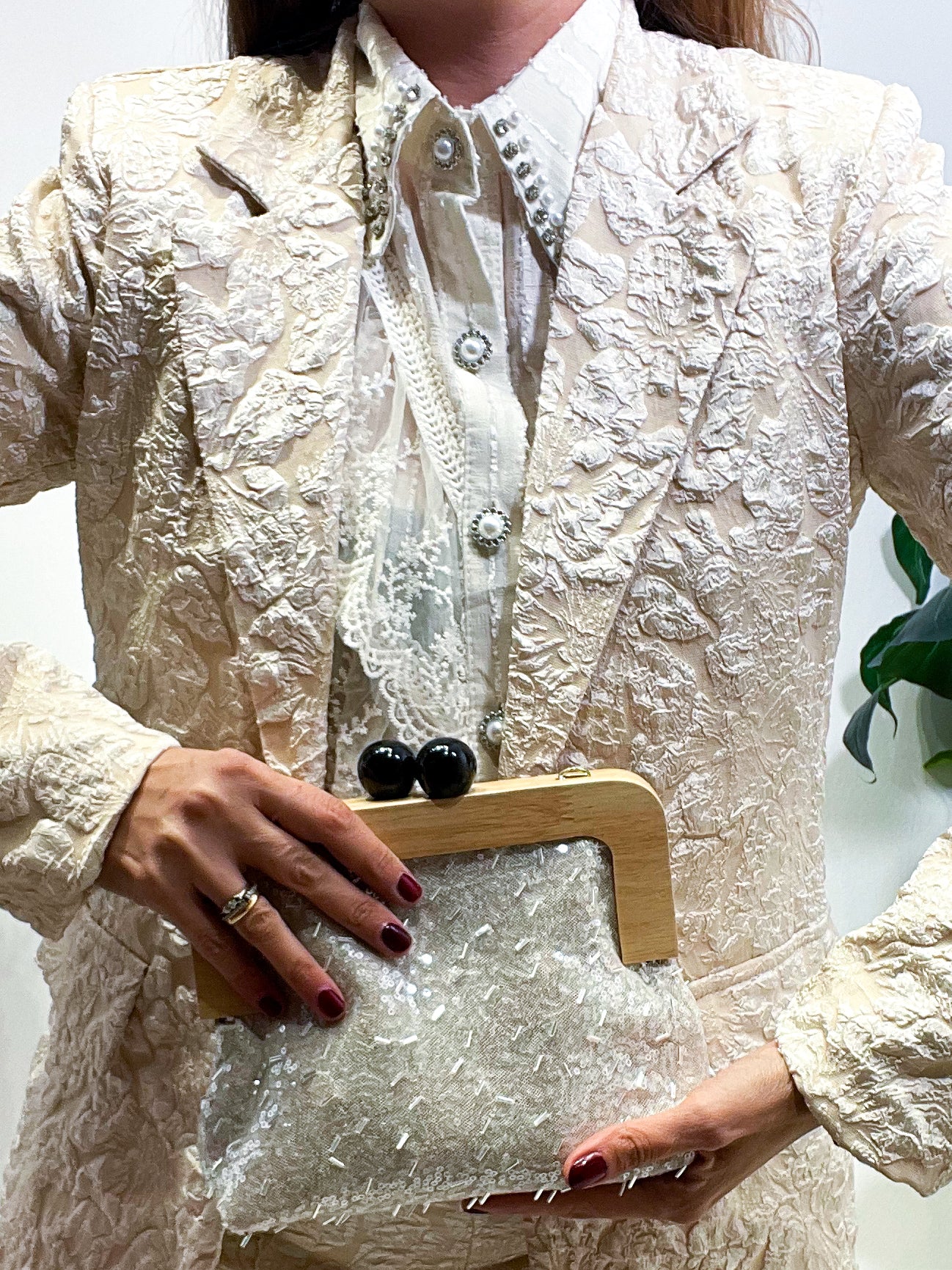 Un tailleur diverso dal solito. In tessuto damascato tono su tono di colore composto da giacca con bottone e foseran interna. Shorts a vita alta con zip laterale ed elastico sul dietro. Taglia unica, con una vestibilità fino ad una M, per un tailleur super raffinato ed easy.