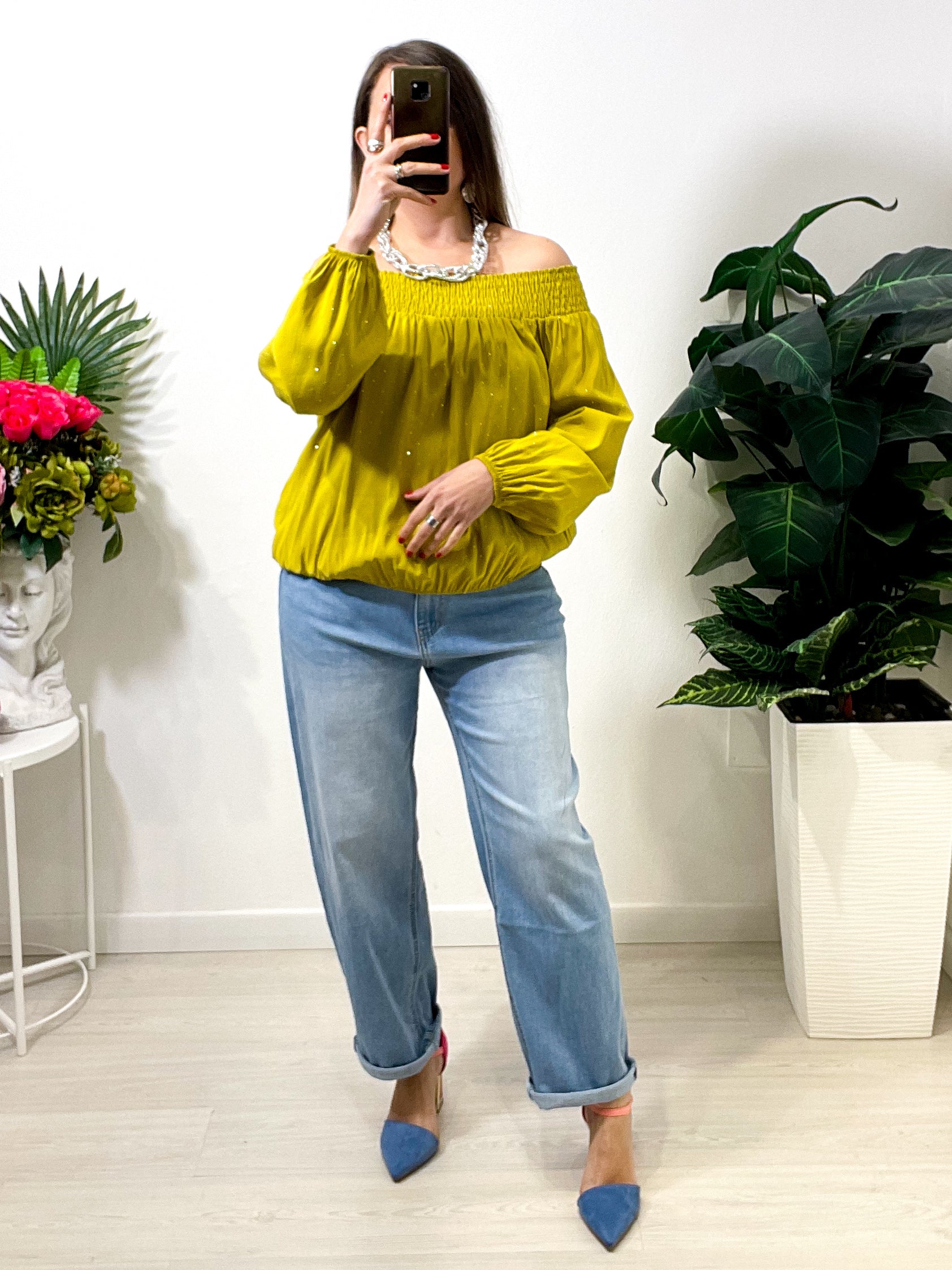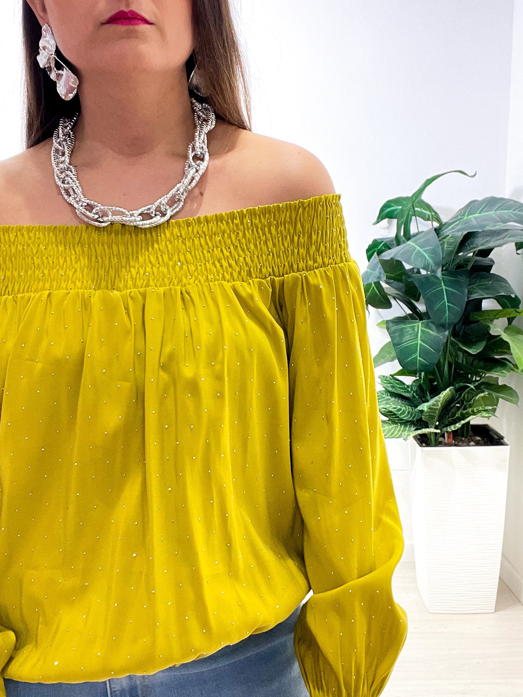 Raffinato top con scollo a barca ad elastico e strass crystall, perfetto per aggiungere un tocco di femminilità a qualsiasi look. Elastico anche alla base per regolare la lunghezza.