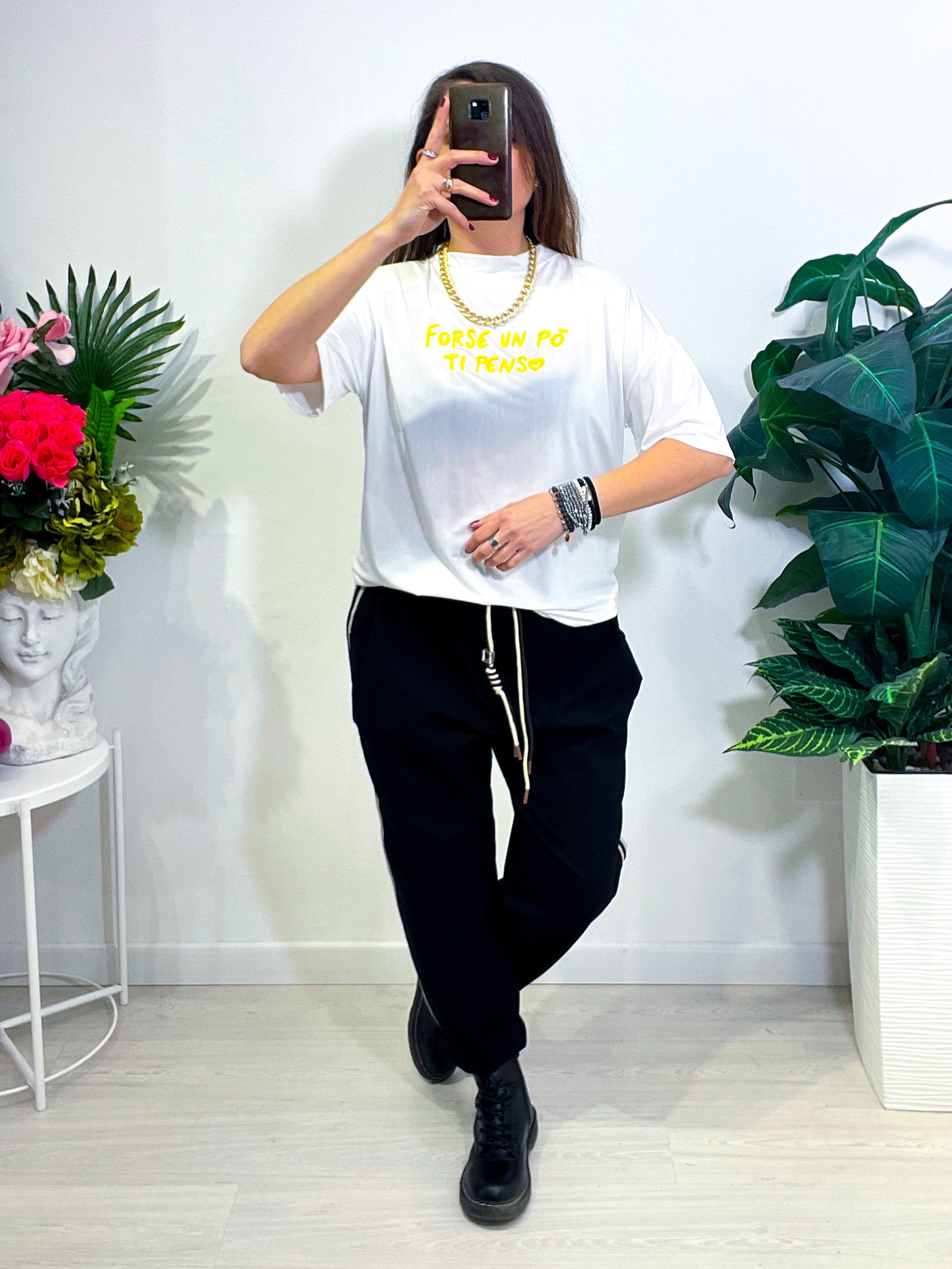 Questa t-shirt tessuto elasticizzato basic ed è il capo perfetto per chi ama le tshirts, ma preferisce farlo sapere con un po’ di ironia. Il ricamo rende preziosa una semplice tshirt e le spalline la rendono ancora più speciale.Dillo con una tshirts.